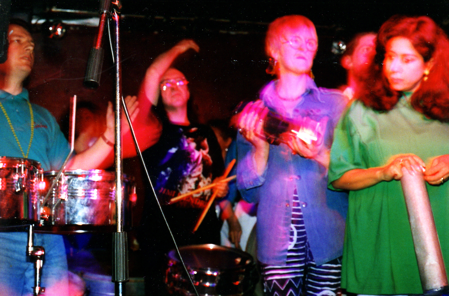 After he moved to Hastings, Damian had some Surdos constructed at a metal works and I arranged for us to rehearse in a Church Hall near to the, now closed, Light From Darkness Studios. Through doing some shows on trial FM radio stations I had come to know the people who were involved and was able to get them to send a roving reporter down to one of our rehearsals on a Sunny Sunday afternoon. Over the next few weeks we had loads of Women come down and join the band, Rachael, Rebecca, Jane, Jenny.