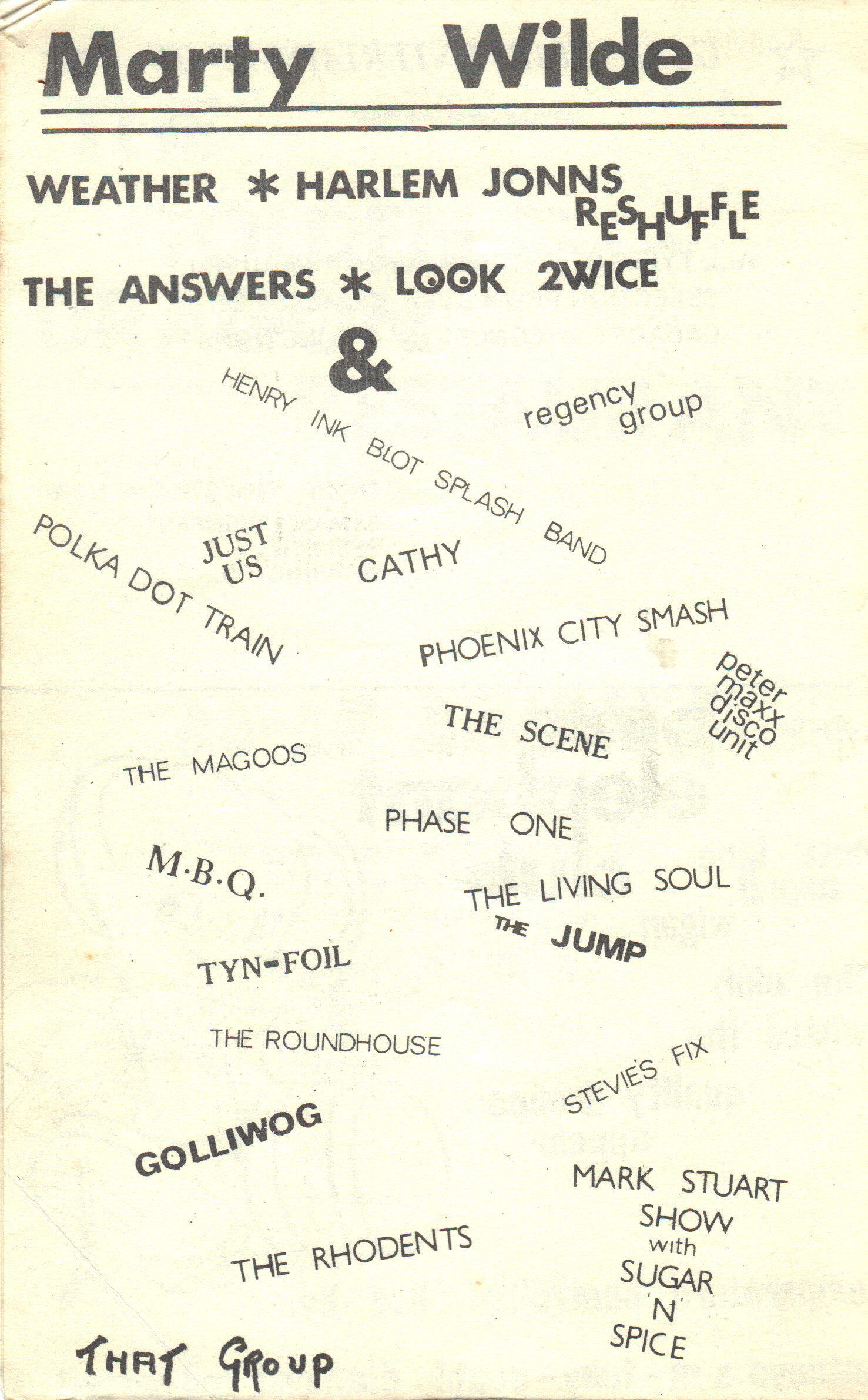 Jim Woodward on vocals Stuart guitar and my good friend no longer with us Bob Sapsed on bass. We were aslo joined by my insane Scots friend Danny Rochead as manager. He had energy though and soon we had gigs, badges and T shirts. He got some strange gigs too. One time within 24 hours he had us playing at a pub in Kensington, a Handicapped day in Hyde Park and a Greek wedding in the afternoon where we got paid off. No surprise as they played mostly self penned numbers with titles like "Mast*rbation" and "Sisterhood". They also played a song called Nasty by Kevin Coyne who was brilliant. We did an interesting gig at The Canterbury in Brixton supporting him. On another occasion we played at a big RAR gig at Wandsworth Town Hall supporting reggae band Misty. Ian Dury was there and was polite enough to go and sit out front and listen while we played. What a beautiful man. Respect !