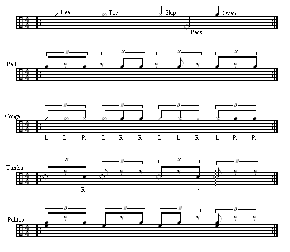 Rumba Guaguanco is a universally popular variety of Rumba which is recognisable by the melody of the Conga and Tumba open notes. It was developed by the slave communities of Cuba and preserves many original African drum phrases. Especially in the soloing of the higher pitched Quinto drum which is improvised throughout. The lead drummer or soloist will watch and accompany or react to moves of the dancers performing with the group.